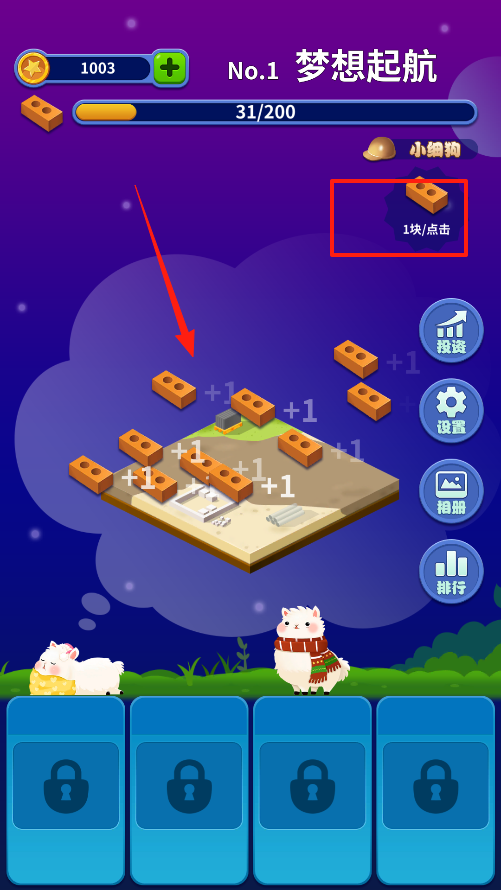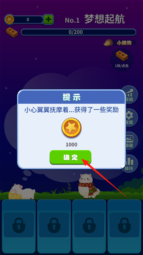 2、界面上有小狗狗点它每次能拿到1块砖,拿到砖块后砖块会自动加到建筑进度里,慢慢把梦想起航的建筑盖起来,看着进度条往前涨。