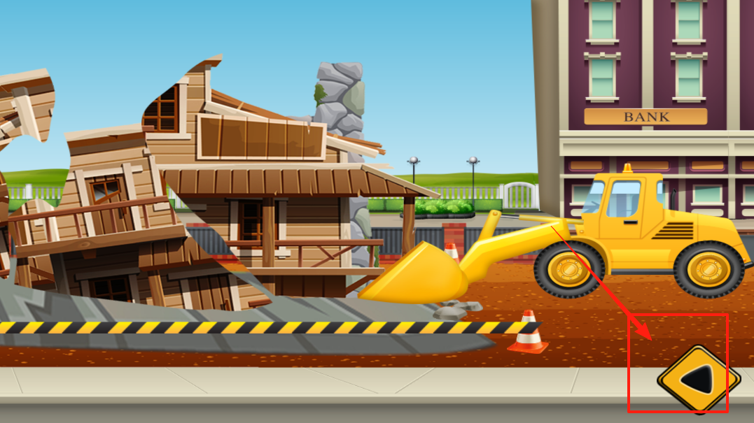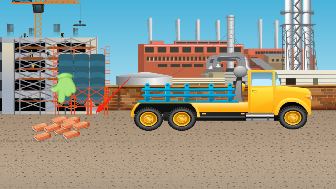 2、场景是建筑工地有黄色卡车和砖块,跟着绿色手套指引点击砖块把砖块放到卡车上,然后驾驶卡车把砖块运到需要的地方,帮工地运送建筑材料。