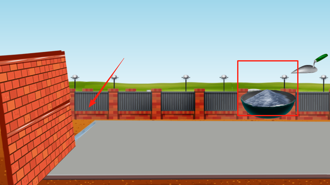 3、这里有砖墙砂浆和铲子,点击砂浆用铲子把砂浆弄到砖墙上,然后把砖块垒起来,一块一块砌墙慢慢把砖墙建好,完成建筑工作。
