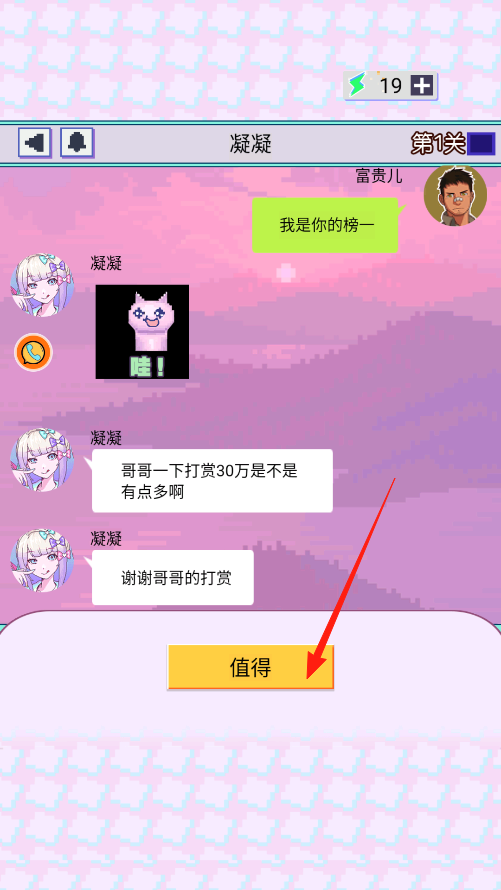 2、聊天框里凝凝说完话,出现值得按钮,点一下富贵儿就会回复对应的话,推进这段对话,每选一个回复都能看到凝凝新的反应,让聊天继续下去。