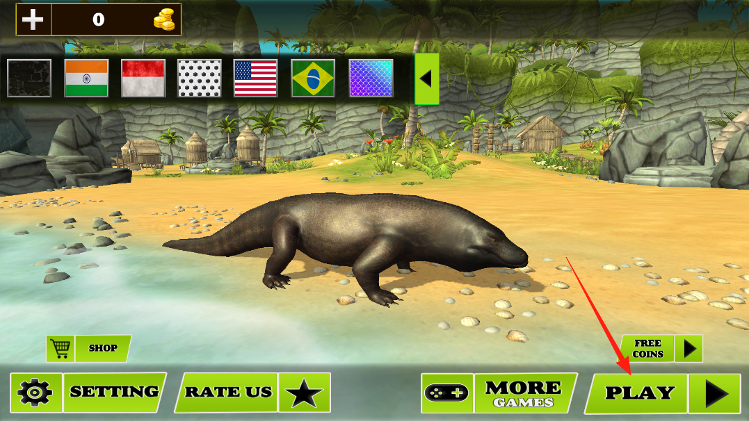 1、点击PLAY进入游戏模式选择,选好模式后操控画面里的科莫多龙在沙滩丛林场景里活动,完成任务或者自由探索都行。