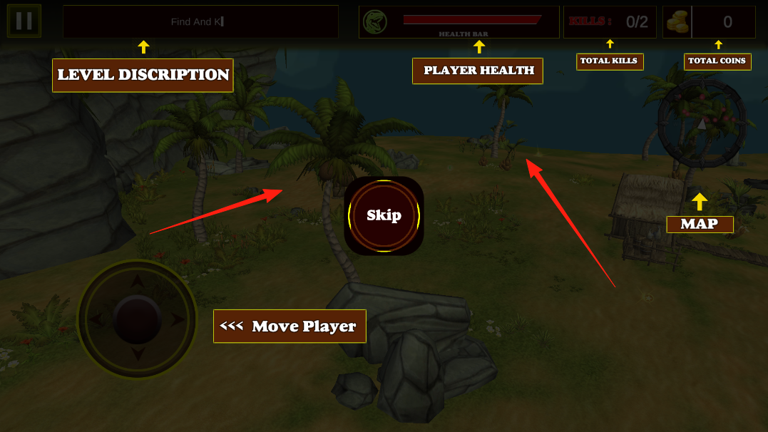 3、进入游戏场景,用左下角摇杆Move Player控制角色移动,在丛林里找目标,上方能看到健康值杀敌数这些信息,按任务提示Find And K去行动,完成杀敌目标。