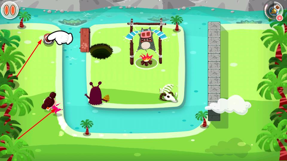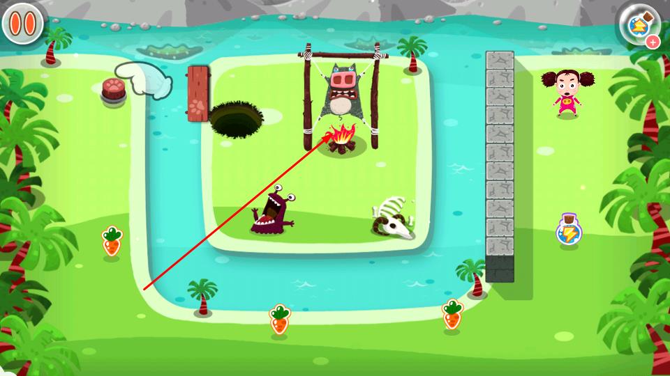 1、观察岛屿场景,操控角色移动,避开怪物,收集胡萝卜,触发红色按钮等机关,改变场景布局解锁新路径。