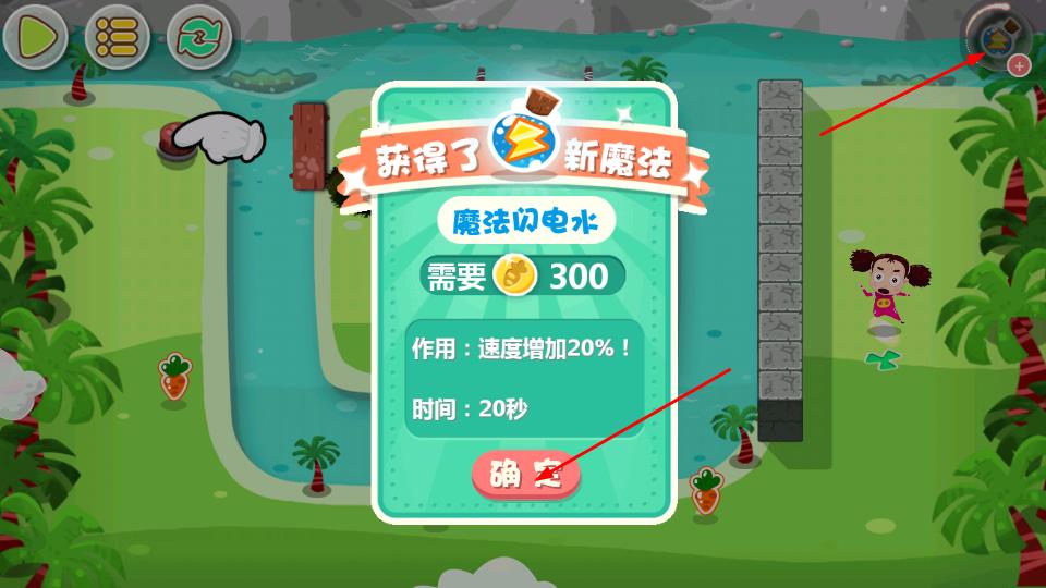 2、点击右上角魔法图标,花费金币解锁闪电水等魔法,使用后获速度加成,限时提升行动效率应对挑战。