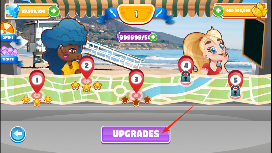 1、点开UPGRADES就能升级餐厅啦,可以用钻石或者金币来提升各种功能,比如让做菜更快,或者让店里能坐更多客人,升级后玩起来会更轻松哦。