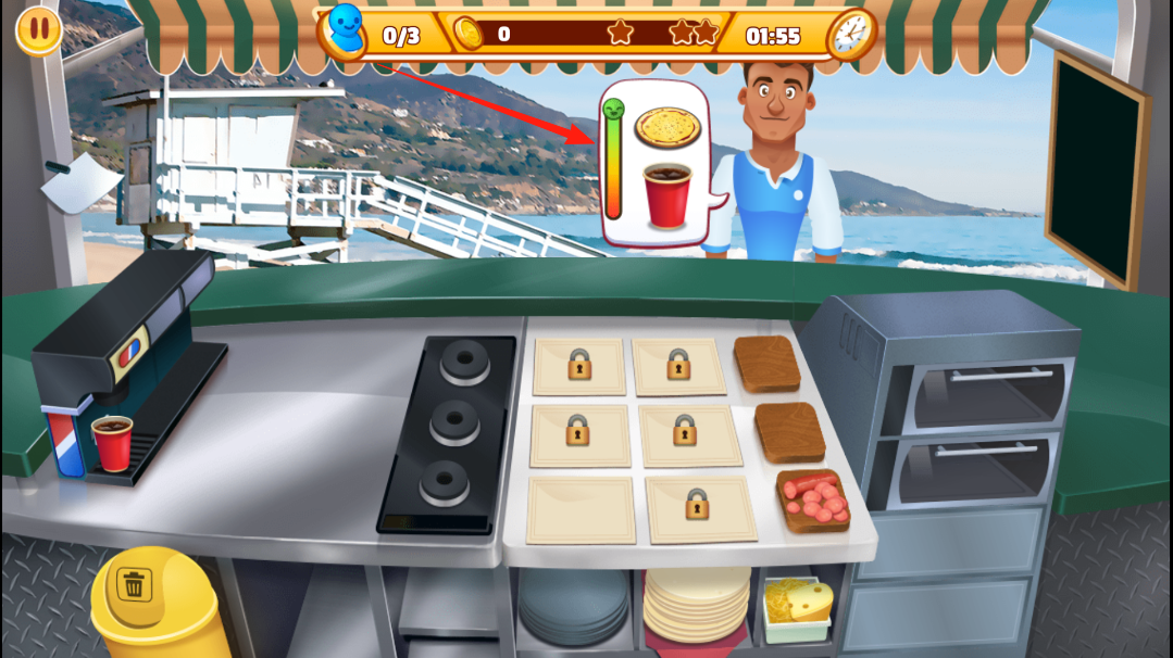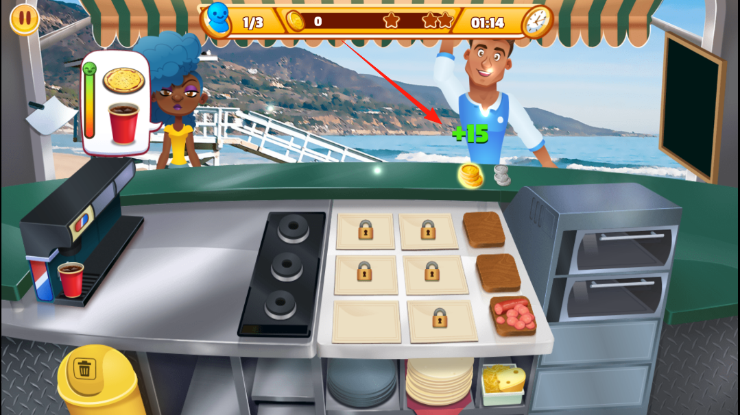 2、注意看客人头顶的气泡,那里会显示他们想吃什么,看到披萨或者咖啡的订单后,去厨房找到对应的材料做好,再端给客人就能完成任务拿到奖励。