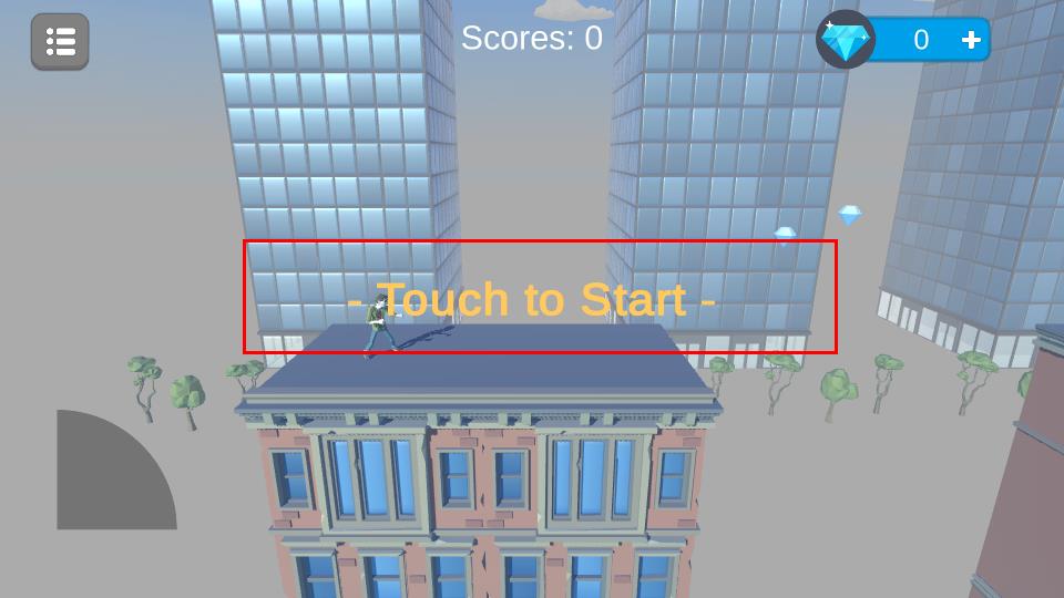 1、首先进入界面,点击Touch to Start按钮,角色开启城市屋顶跑酷之旅,这是进入游戏的初始操作。