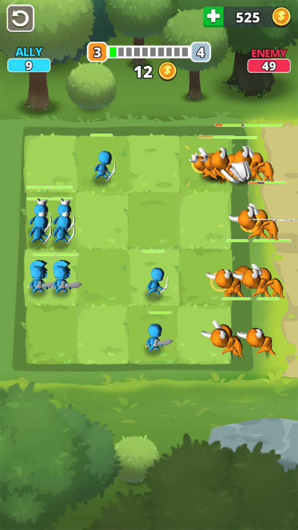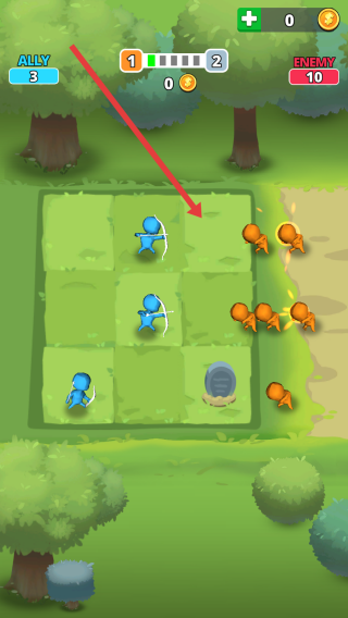 2、对战时合理布置盟友位置,如弓箭手优先站前排两侧,利用射程压制敌方橙色部队,同时留意敌方进攻路线,及时调整阵型应对。