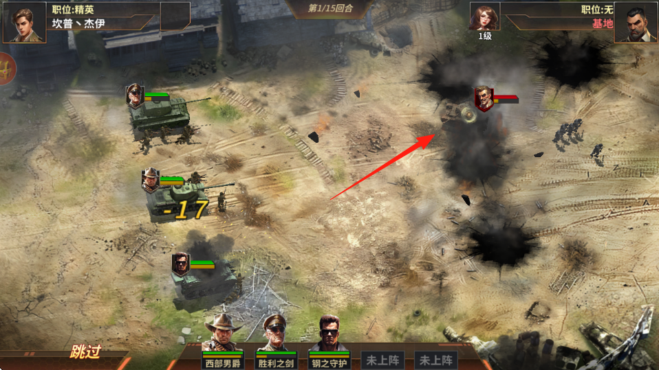 1、战斗阶段,点击红箭头指向区域,指挥己方坦克绿色阵营移动、进攻,选择敌方坦克红色血条为目标,利用西部男爵等将领技能。