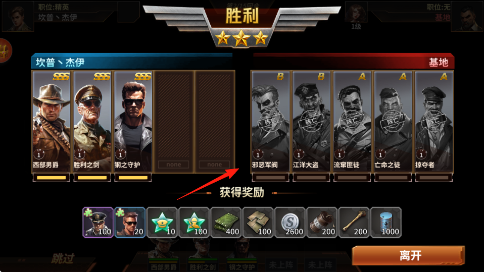 3、胜利后,进入结算界面,红箭头指向敌方阵亡将领邪恶军阀等,获取奖励将领碎片、资源,己方将领西部男爵、胜利之剑升级,提升战力。