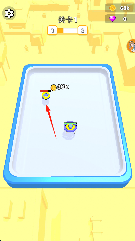 3、战斗中陀螺沿红箭头方向追击敌方,摧毁敌方后获取金币经验,升级陀螺,继续挑战下一阶段,或强化陀螺,提升战斗能力。