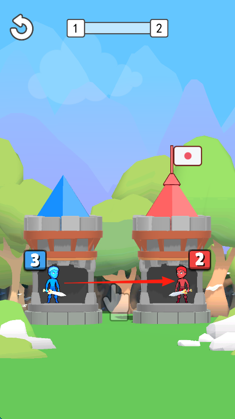1、关卡1,蓝色城堡对红色城堡,拖动蓝色士兵,进攻红城堡,兵力多者胜,注意上方进度条,推进战斗进程。