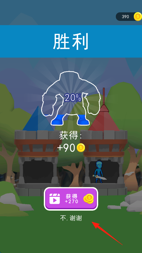 3、胜利界面,显示获得金币、解锁新战力,点击不,谢谢跳过广告,或看广告获更多金币,积累金币用于升级城堡、扩充兵力。