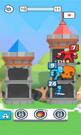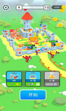 2、战斗中,蓝色士兵占领红城堡,兵力合并,摧毁红方防御,获取金币,上方进度条满格,进入下一阶段,留意敌方反击。