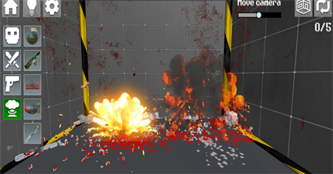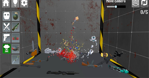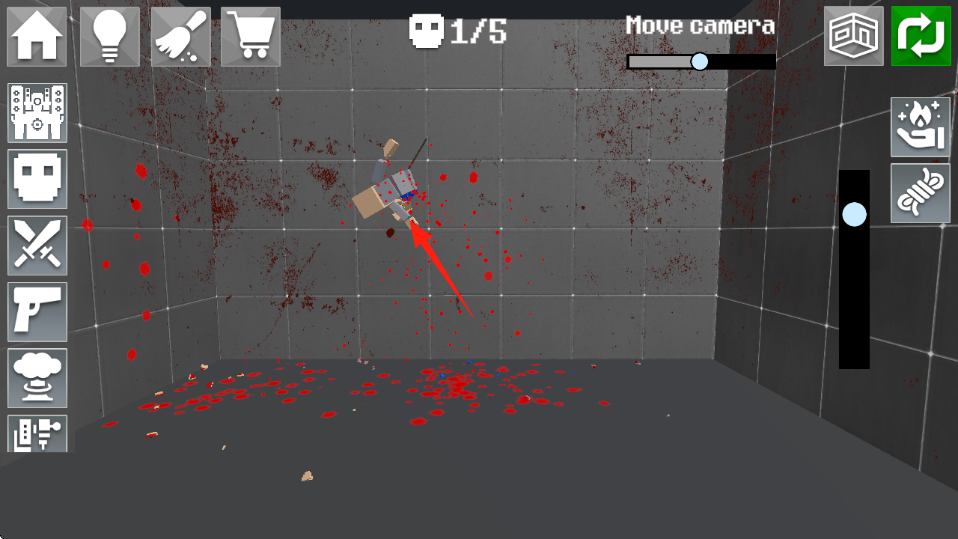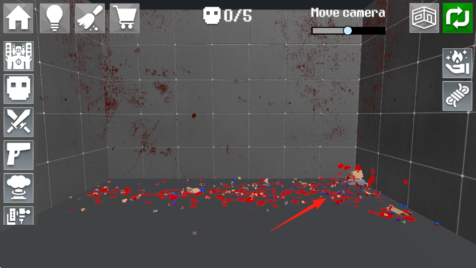 3、持续攻击,消灭所有目标计数到0/5,清理战场血迹、残骸红箭头指向区域,可使用左侧工具清理场景,完成关卡。