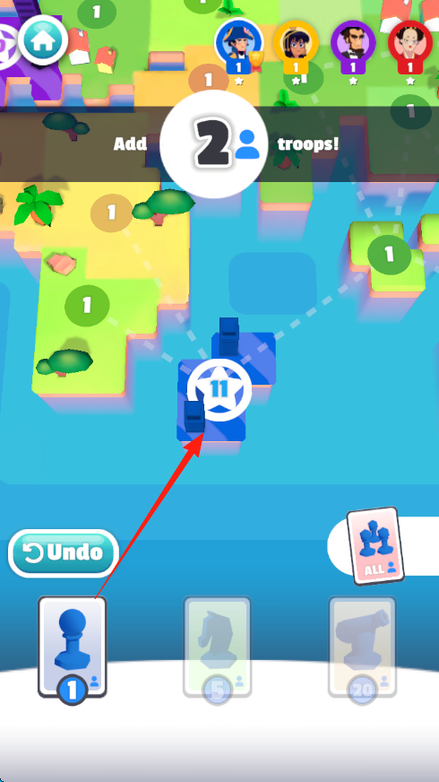 1、在地图界面,点击红箭头指向的蓝色领地数值11,消耗下方棋子如蓝色兵,部署兵力,占领领地,增加己方势力范围。