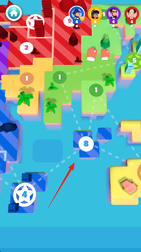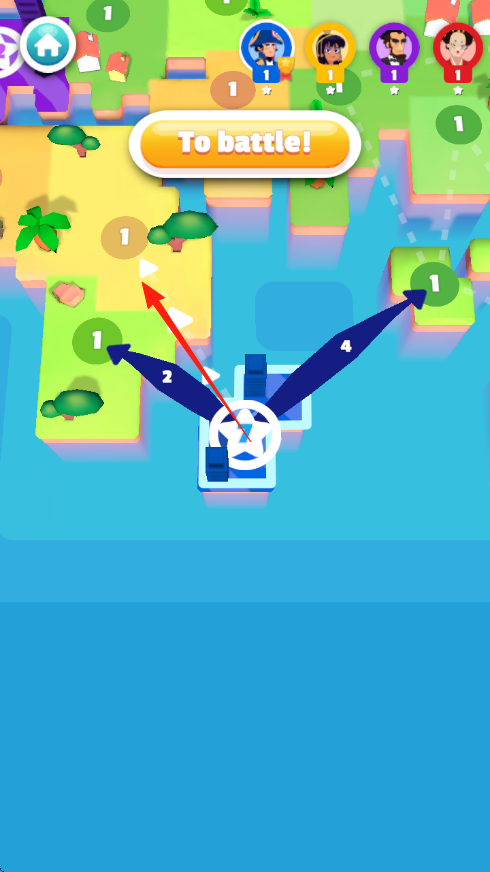 2、兵力部署后,点击Tobattle!,沿红箭头方向,进攻相邻绿色、黄色领地数值1,分配兵力如2人攻绿、4人攻黄,消耗敌方兵力。