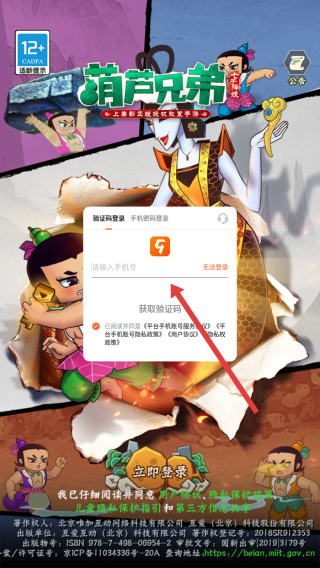 1、在葫芦兄弟:七子降妖登录界面,按照箭头指示处完成验证如手机号登录,进入游戏登录流程。