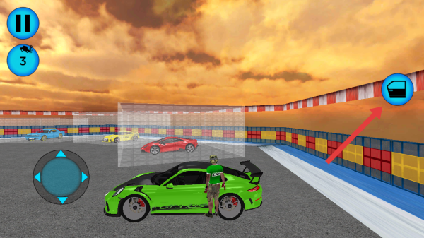 1、开局进入游戏,需要靠近车辆点击右侧车门的图标,进入绿色赛车,做好赛前的一切准备。