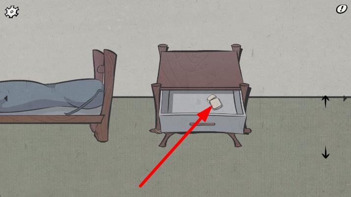 2、进入房间场景,按红色箭头指引,打开床头柜抽屉,获取里面的物品纸条,用于后续解谜。