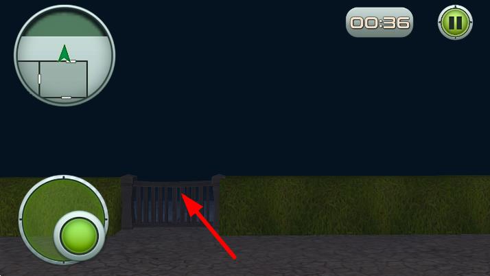 3、继续用摇杆控制角色,沿红色箭头指向,前往栅栏处,尝试交互或穿过,推进游戏进程,完成关卡探索。