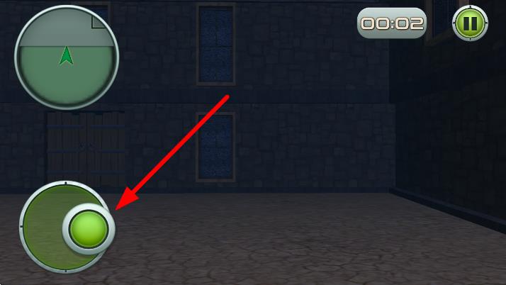 2、进入游戏操作界面,通过左下角绿色摇杆,按红色箭头指引方向滑动,操控角色在场景中移动,探索环境。