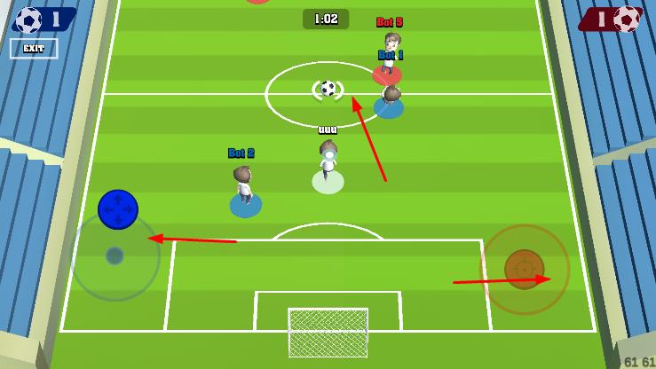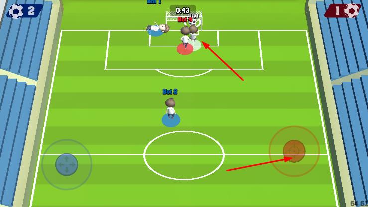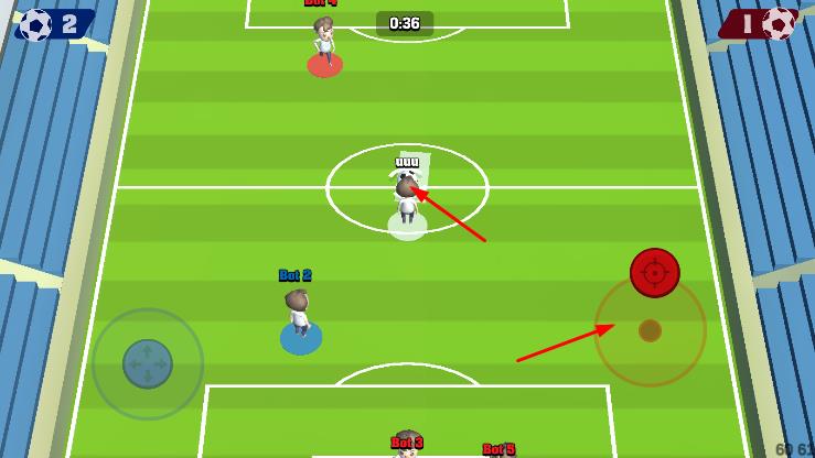 1、进入游戏,在足球比赛场景中,操控自己的队伍进行比赛,通过虚拟按键控制角色移动,争夺足球。