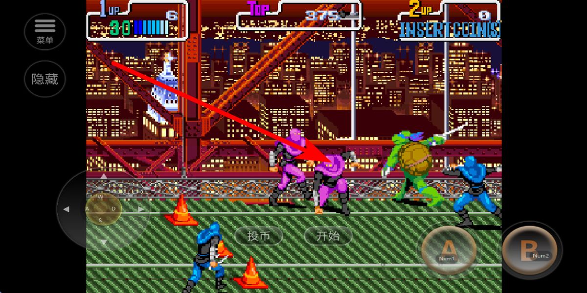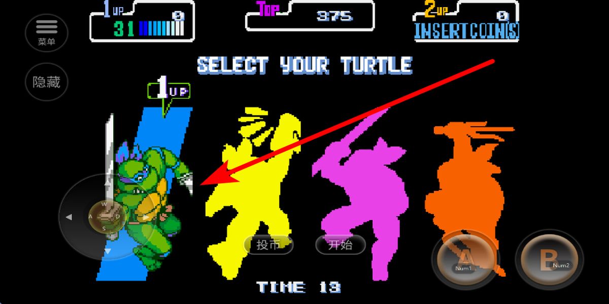 1、启动选择角色:安装完成后点击投币按钮,再开始游戏进入角色选择界面,挑选心仪的忍者龟角色,开启打击邪恶犯罪的闯关之旅。