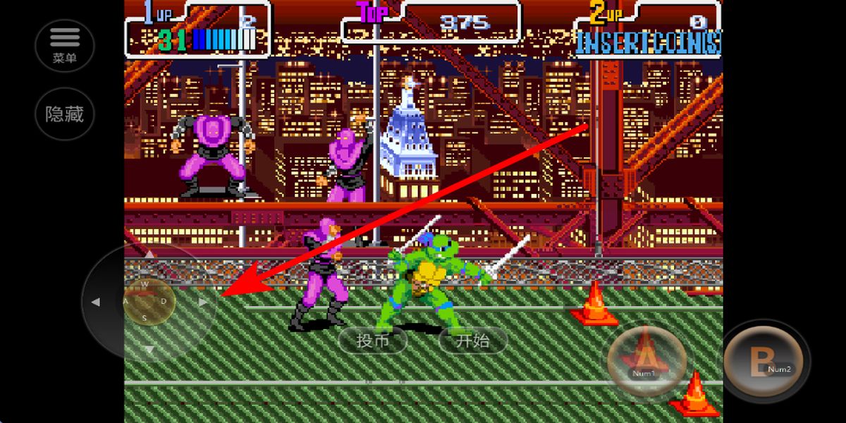2、移动操控,进入游戏后,点击屏幕左侧的虚拟方向键,通过上下左右滑动,灵活控制忍者龟在场景中移动面对敌人以调整战斗位置。