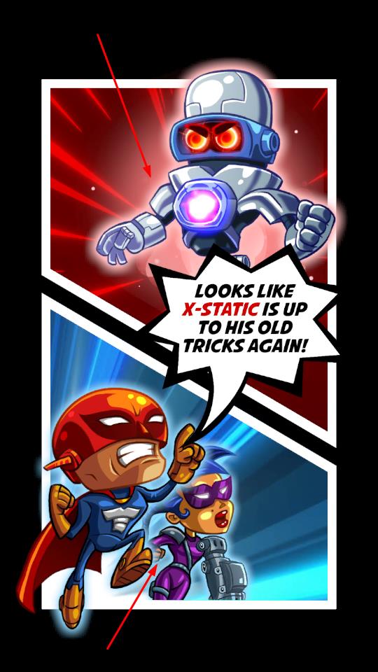 1、开篇以漫画形式展开,反派X-STATIC重施诡计,点击进入关卡,操控身披红披风的英雄,正式投身对抗反派的冒险,借剧情牵引踏入战斗场景。