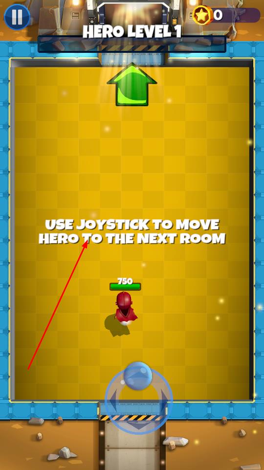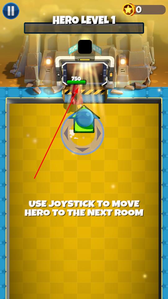 2、进入HERO LEVEL 1关卡后,拖动底部虚拟摇杆,控制英雄朝上方绿色箭头指向的传送门移动,精准操作摇杆调整行进方向,途中留意环境变化,确保移动顺畅。