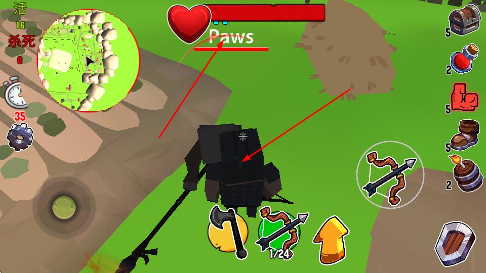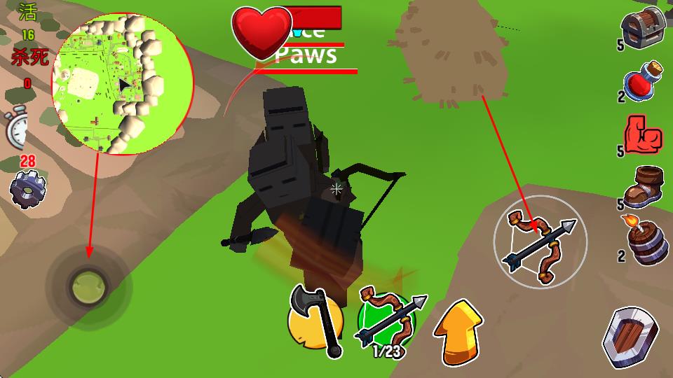 2、战斗时左侧虚拟摇杆操控移动,右侧切换弓箭、斧头武器,瞄准敌人Paws攻击,留意血量条,适时调整策略。
