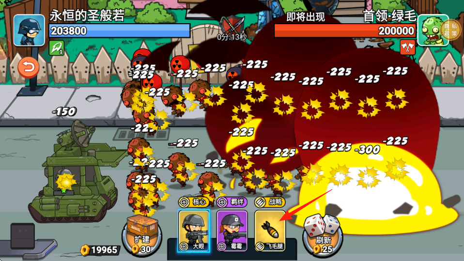 2、僵尸逼近,点击飞毛腿等战略卡牌红箭头,释放技能,清剿僵尸,注意金币,合理使用大靓,霉霉卡牌,强化火力。