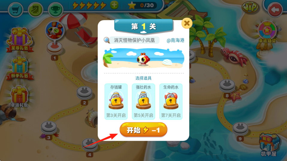 1、在关卡选择界面第1关,点击开始,进入南海港场景,目标消灭怪物保护小凤凰,可选道具需解锁,直接开始战斗。