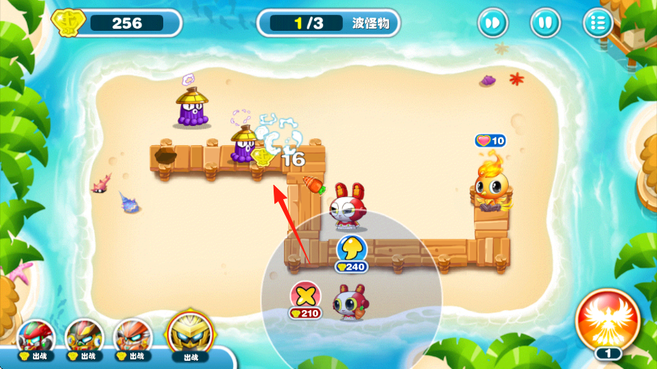 2、战斗中,沙滩地图,红箭头指向紫色怪物,点击下方精灵如兔子,消耗金币出战,攻击怪物,注意波次,合理分配精灵。
