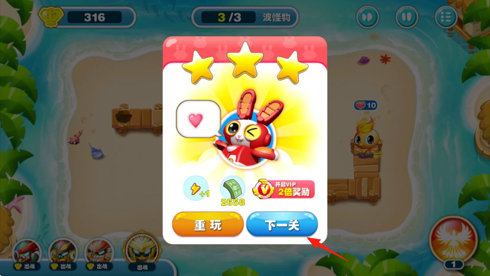 3、完成3波怪物,获三星评价,点击下一关,获取奖励,解锁新精灵、关卡,继续挑战,提升精灵等级、技能,优化战斗策略。