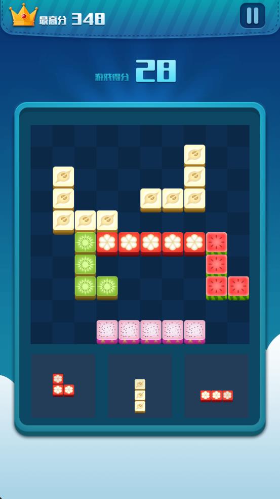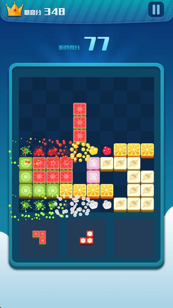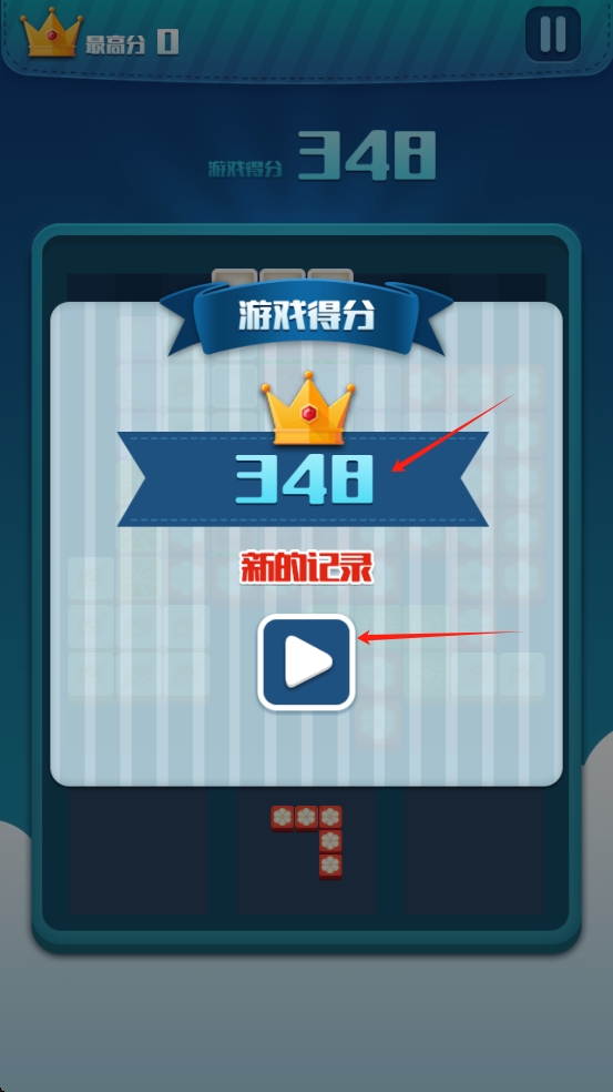 3、游戏结束后结算界面显示新的记录348分,点击播放按钮,重玩挑战更高分数,延续方块消除玩法。