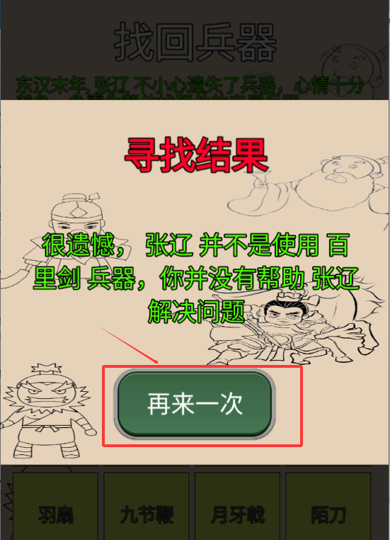3、很遗憾不是“百里剑”兵器,点击“再来一次”。