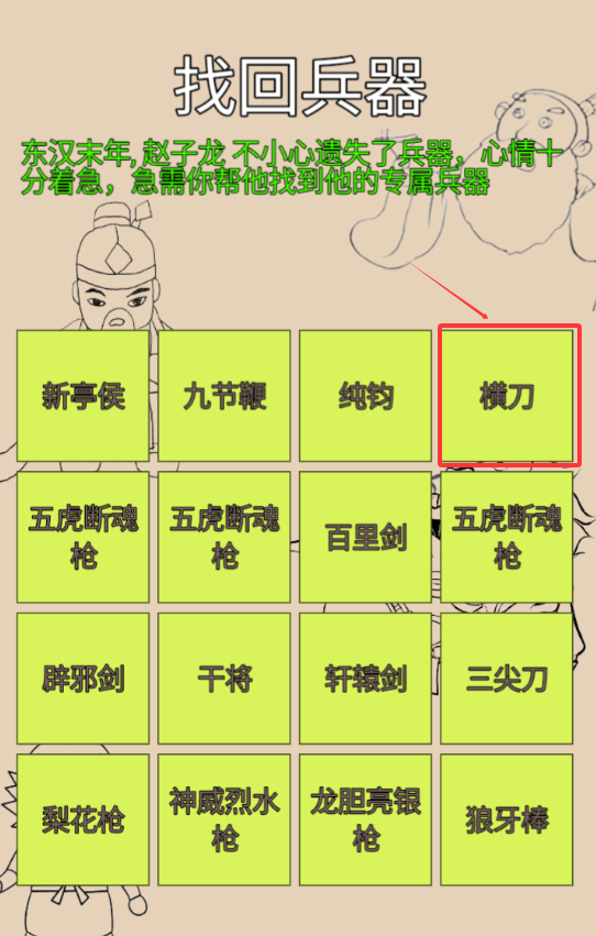 4、再次点击红色框框选择兵器,这次选择“横刀”兵器看看是否找对了。