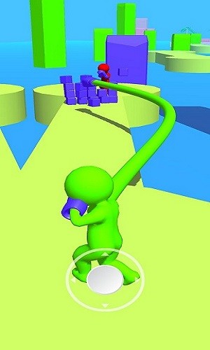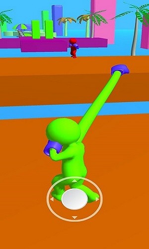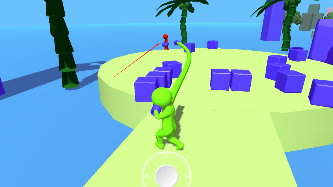 1、点击开始按钮进入对战场景,熟悉虚拟摇杆的移动操作和攻击按钮的使用方法,点击屏幕让小人伸长手臂将障碍击飞。