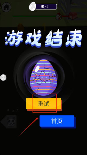 4、结束游戏:当游戏结束后,可以选择“重试”按钮重新开始游戏,或点击“首页”返回主界面。