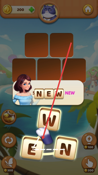 2、进入单词解谜环节,滑动字母拼单词比如NEW,按照顺序滑动,并填满上方空格,完成关卡获奖励。