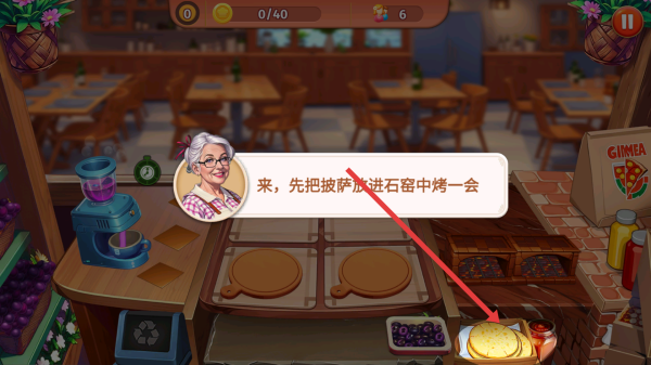 1、开始制作披萨教程,按提示如放披萨进石窑烤,点击食材面饼以及配料,拖到对应设备完成烹饪。