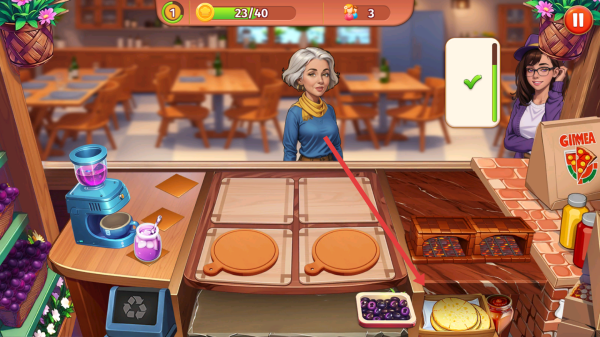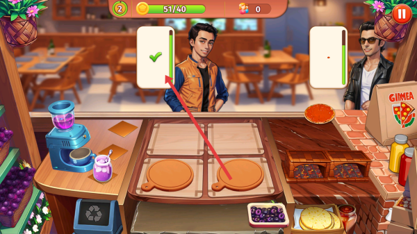 2、学会了如何制作披萨后,遇到后面的关卡顾客点餐,需要看头顶需求条,及时送达做好餐食。