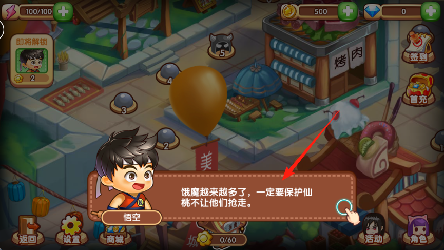 1、主城界面,悟空提示保护仙桃防饿魔,点击对话推进,熟悉烤肉店,签到,首充等功能,金币500,可在商城买道具,解锁角色。
