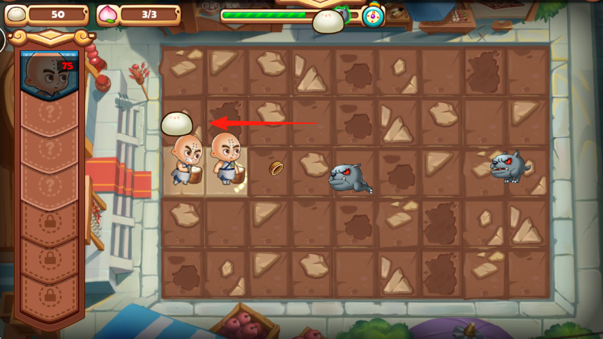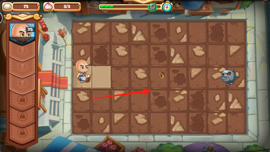 2、冒险关卡沙盒地图,控制角色小和尚,红箭头指向金币、怪物恶犬,移动角色点击红箭头路径,捡金币,躲避攻击恶犬。
