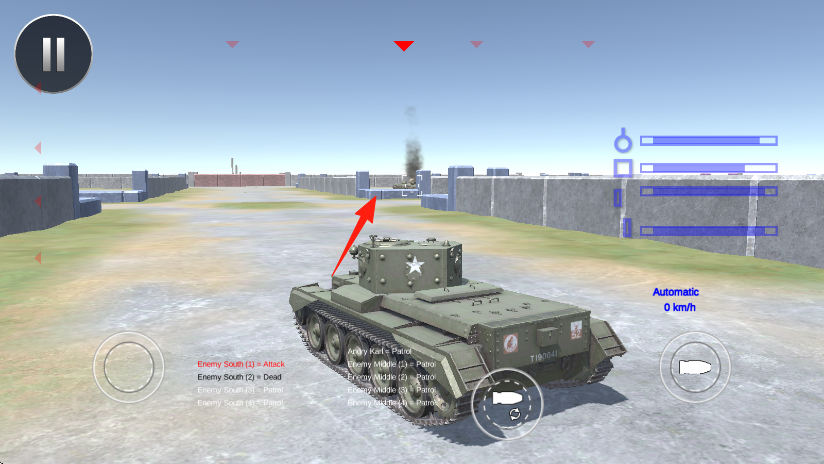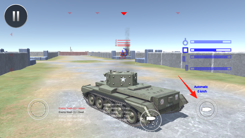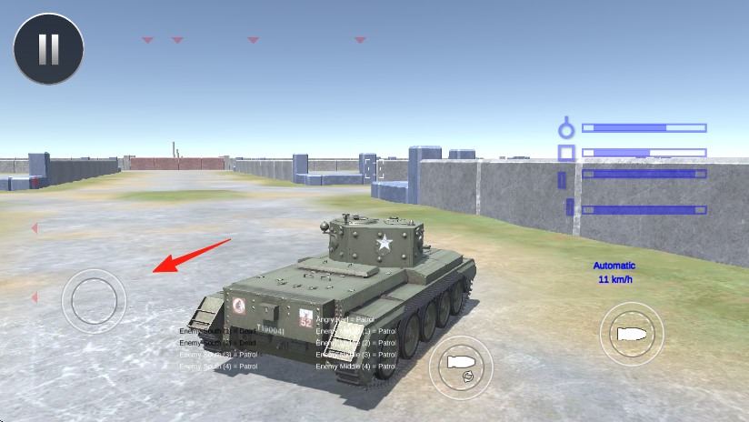 1、进入关卡,驾驶美军坦克绿皮、白星,红箭头指向敌方坦克,左侧虚拟摇杆控制移动,右侧按键射击。
