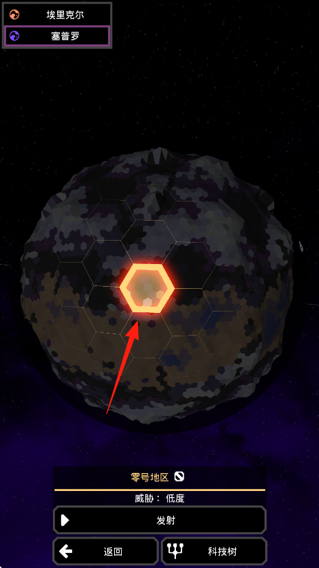 1、战役起点选塞普罗星球红箭头,确认后进入该星球界面,左上角切换埃里克尔塞普罗,选择零号地区威胁低度,点击发射。