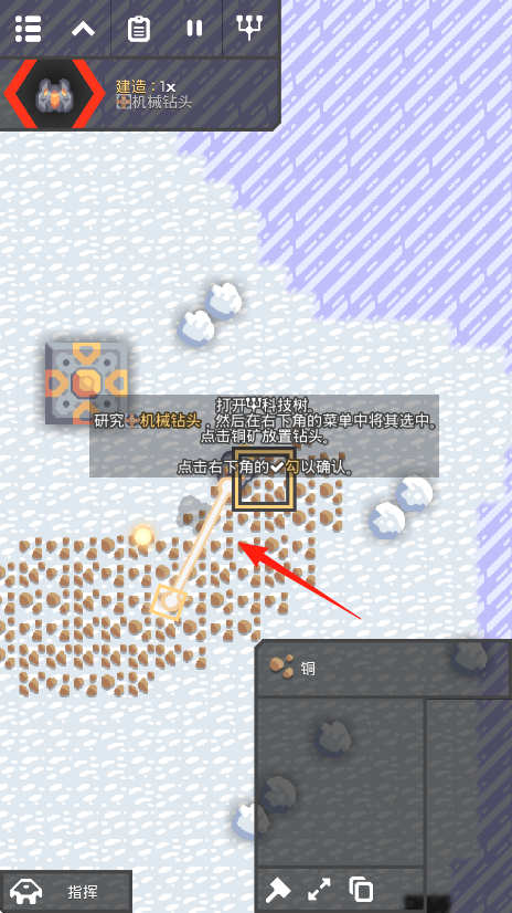 2、到达塞普罗星球区域,按提示研究机械钻头-选中-点击铜矿放钻头-确认,红箭头指铜矿,建造钻头,采集铜矿,积累资源。