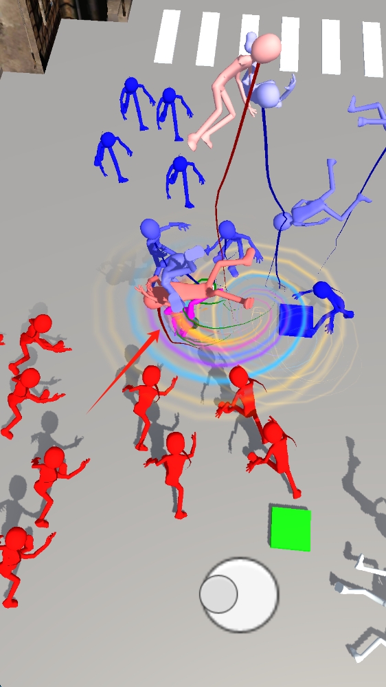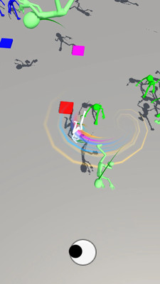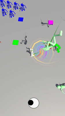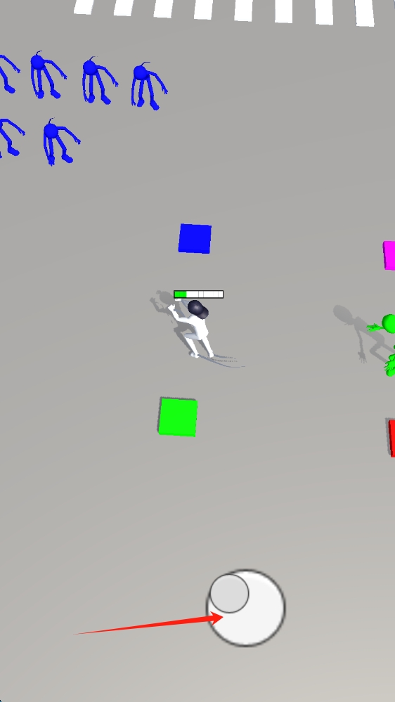 1、在游戏操作界面,灵活使用虚拟摇杆,控制角色在场景中移动,收集各种颜色的方块,为后续战斗做准备。